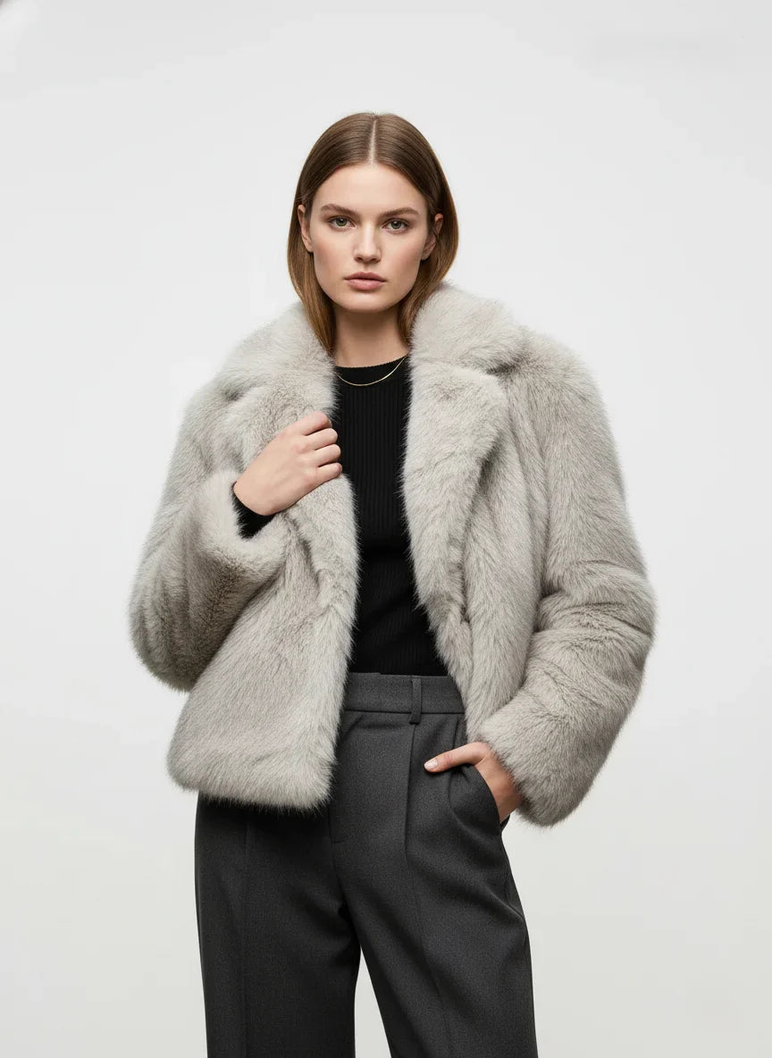 YULIA | VEGANE CROPPED FELLJACKE MIT REVERSKRAGEN