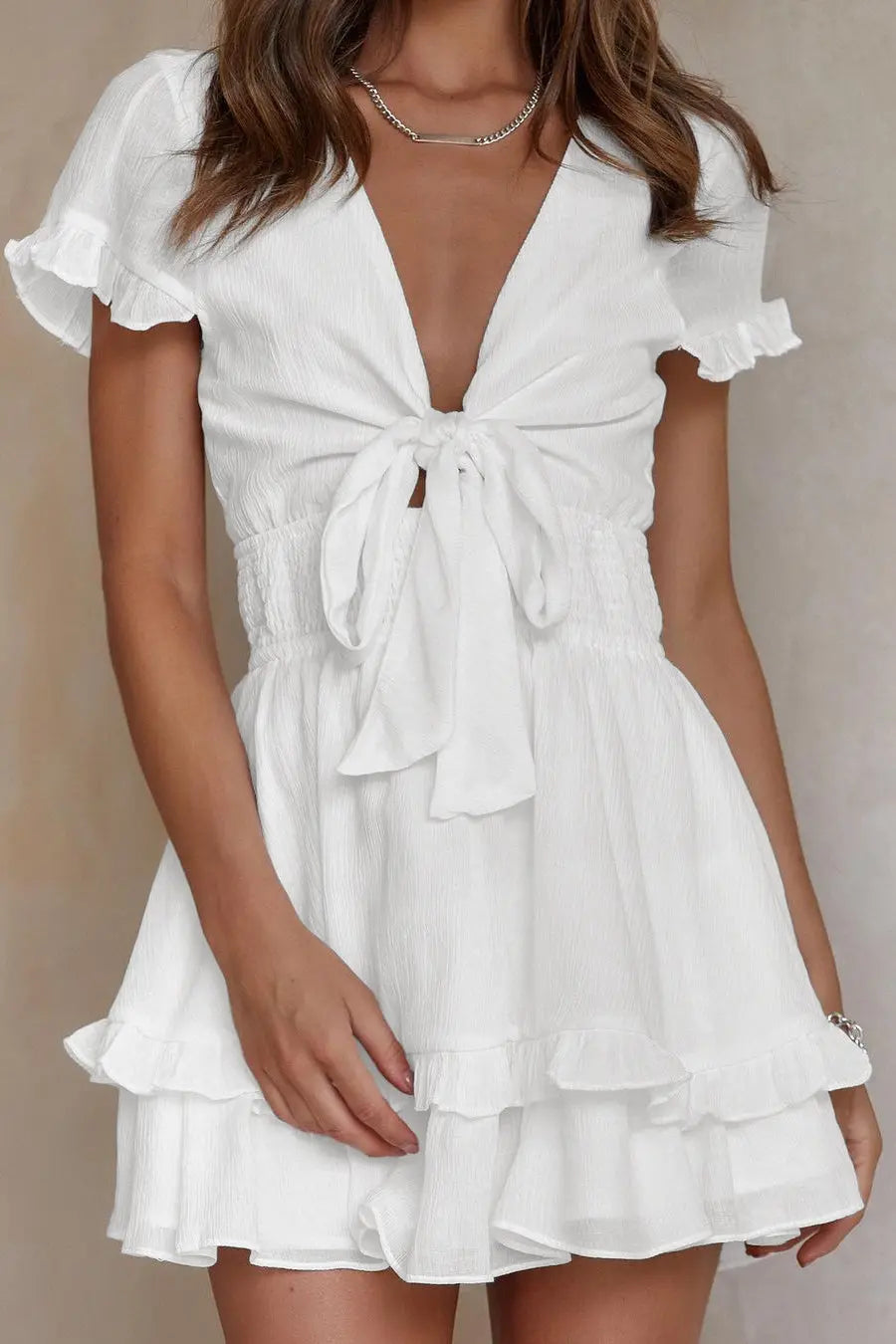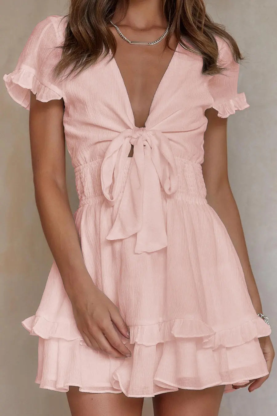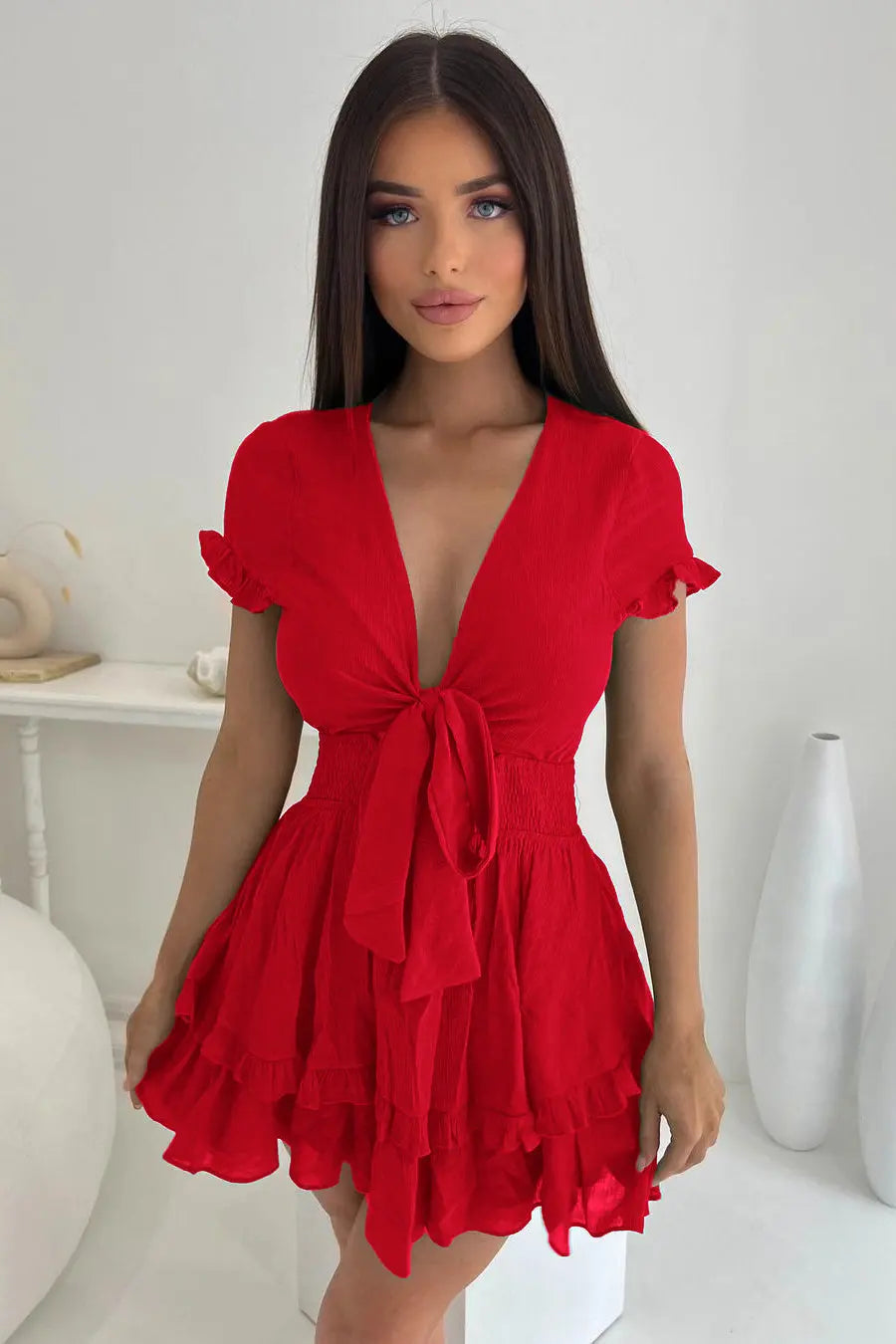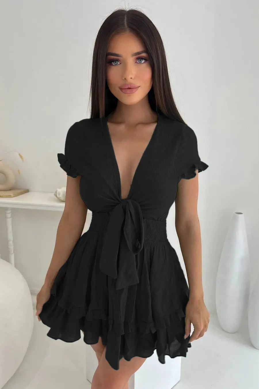 CLARA ist dein stilvoller Begleiter für heiße Sommertage. Dieses Mini-Sommerkleid aus leichtem Chiffon punktet mit einem schmeichelhaften V-Ausschnitt, kurzen Ärmeln und einem verspielten Rüschen-Saum. Der A-Linien-Schnitt sorgt für angenehme Bewegungsfreiheit und eine feminine Silhouette. Ob am Strand, beim Stadtbummel oder bei einem Fotoshooting – CLARA passt zu jedem Anlass.