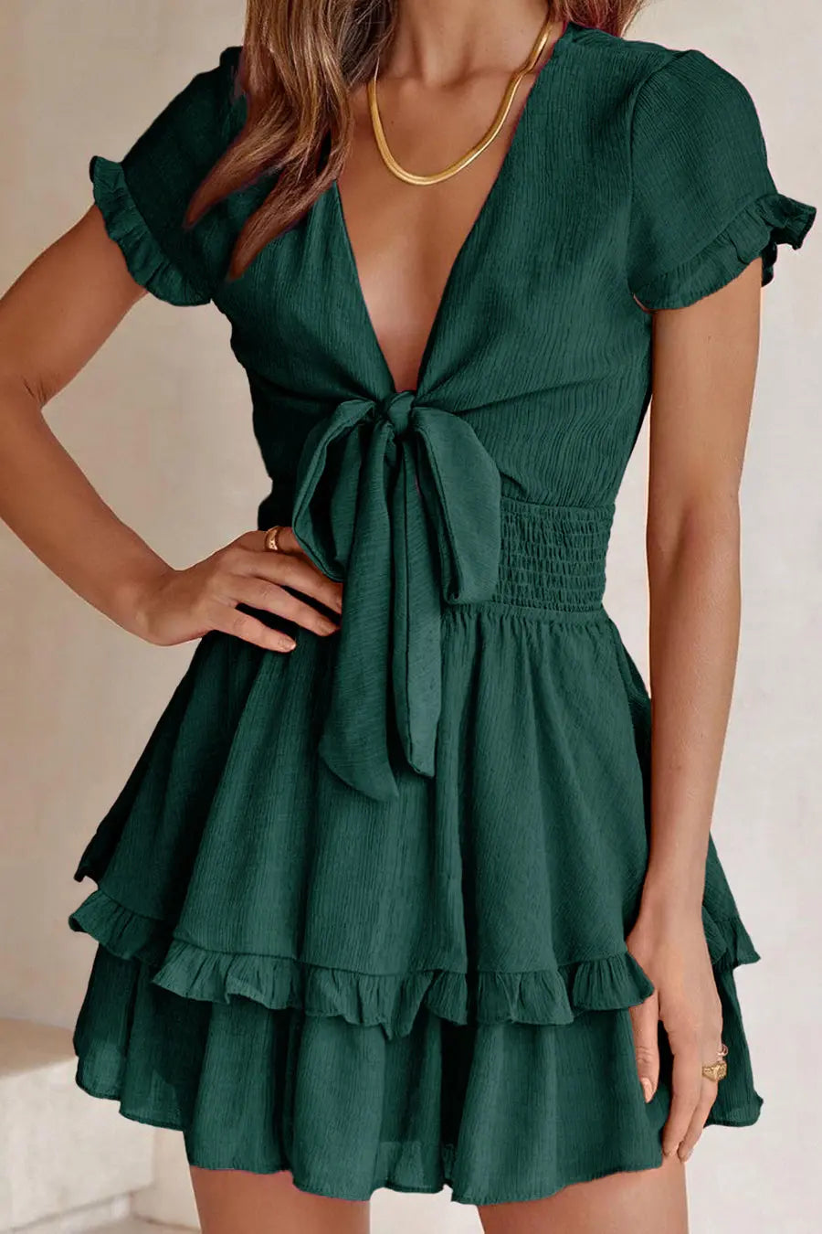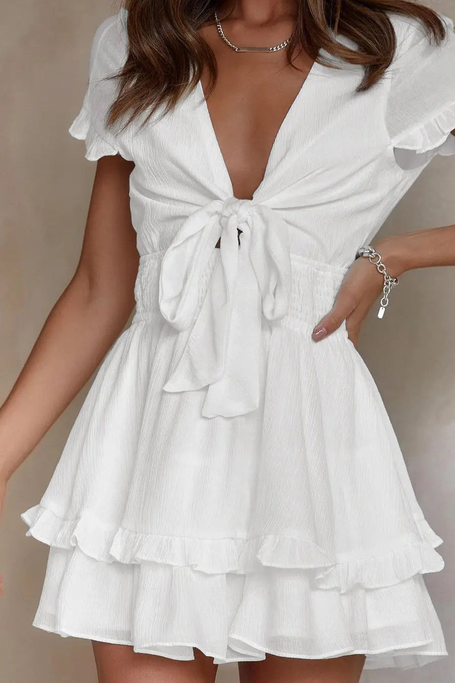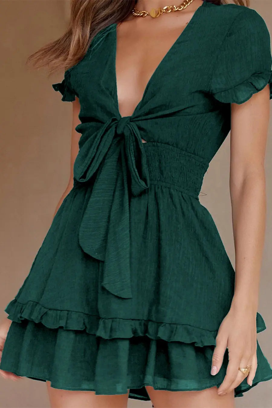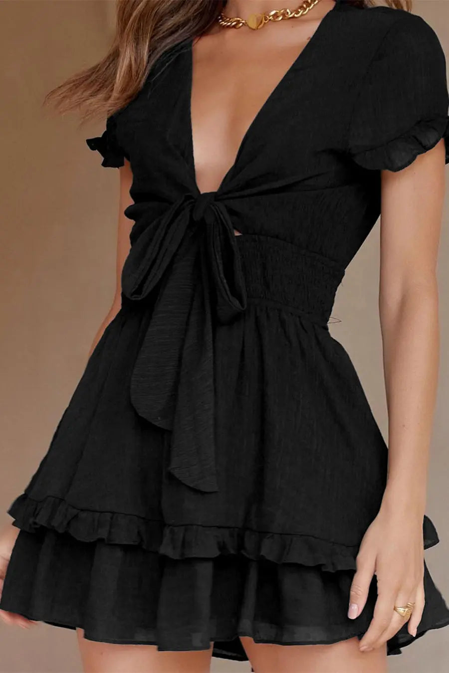 CLARA ist dein stilvoller Begleiter für heiße Sommertage. Dieses Mini-Sommerkleid aus leichtem Chiffon punktet mit einem schmeichelhaften V-Ausschnitt, kurzen Ärmeln und einem verspielten Rüschen-Saum. Der A-Linien-Schnitt sorgt für angenehme Bewegungsfreiheit und eine feminine Silhouette. Ob am Strand, beim Stadtbummel oder bei einem Fotoshooting – CLARA passt zu jedem Anlass.
