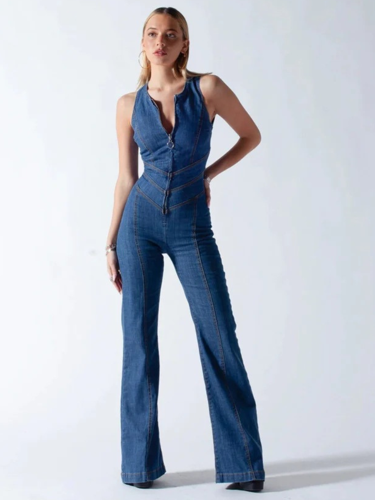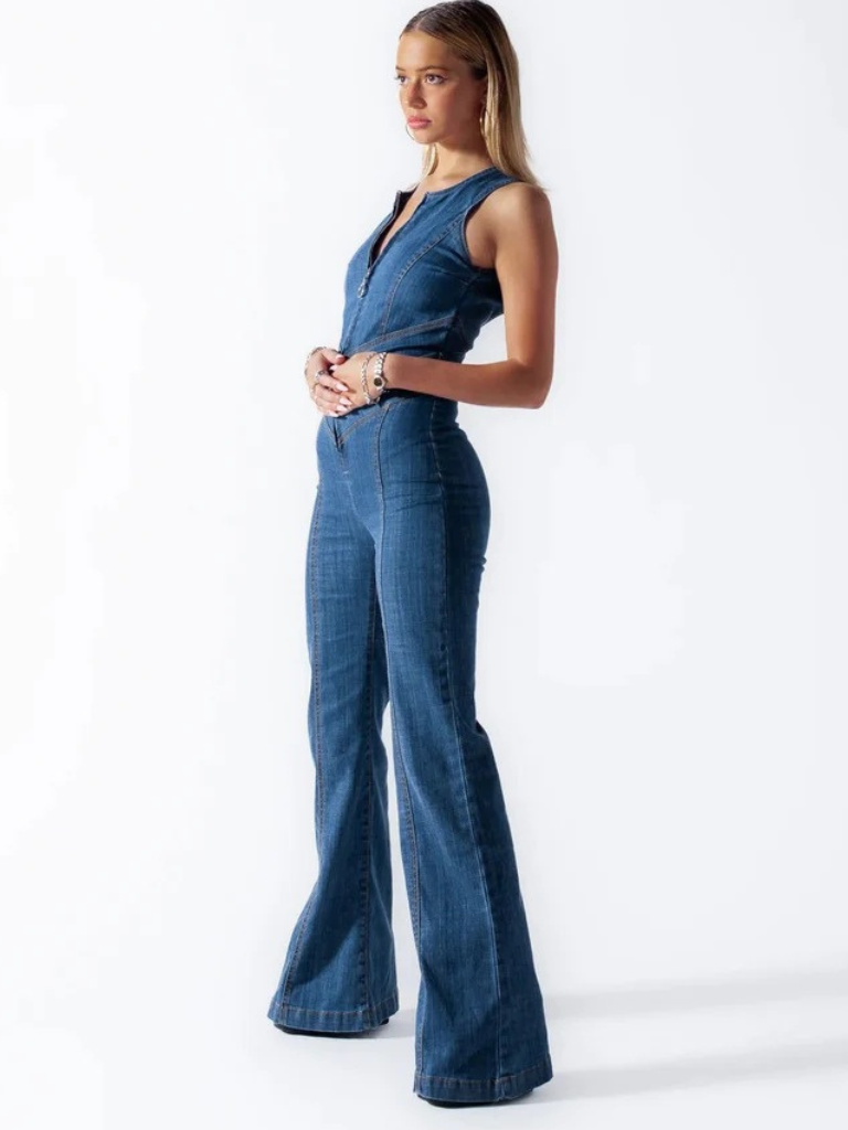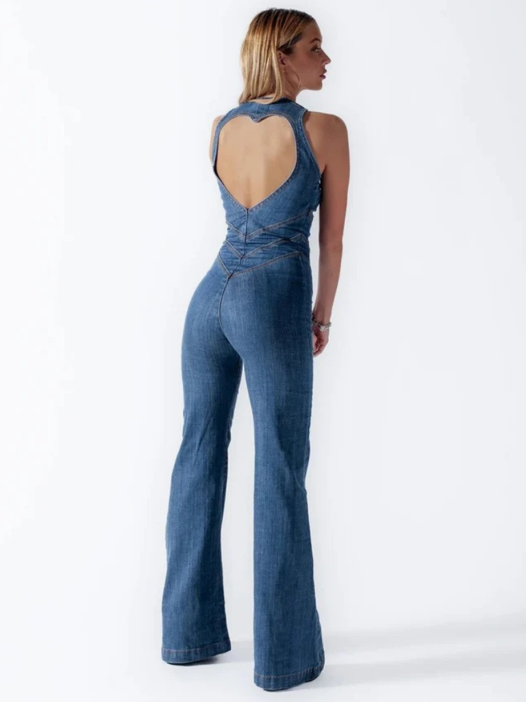 Die Heartcore Denim Jumpsuit vereint eine figurbetonte Silhouette mit coolen 70s-Vibes, Flared Legs und einem Herz-Ausschnitt am Rücken.