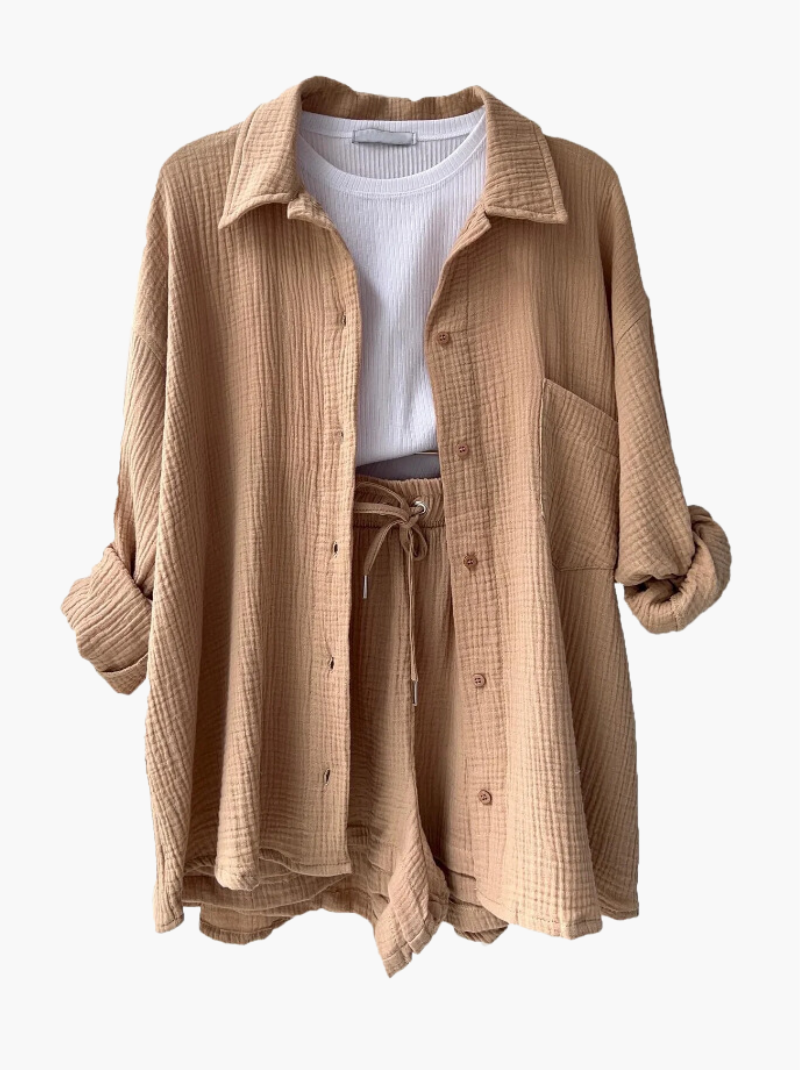 Stilvoll, raffiniert und doch verspielt - dafür steht Laura. Vom gefalteten Kragen, der einen Hauch von Raffinesse verleiht, bis zu den Shorts, die jugendliche Energie ausstrahlen.
