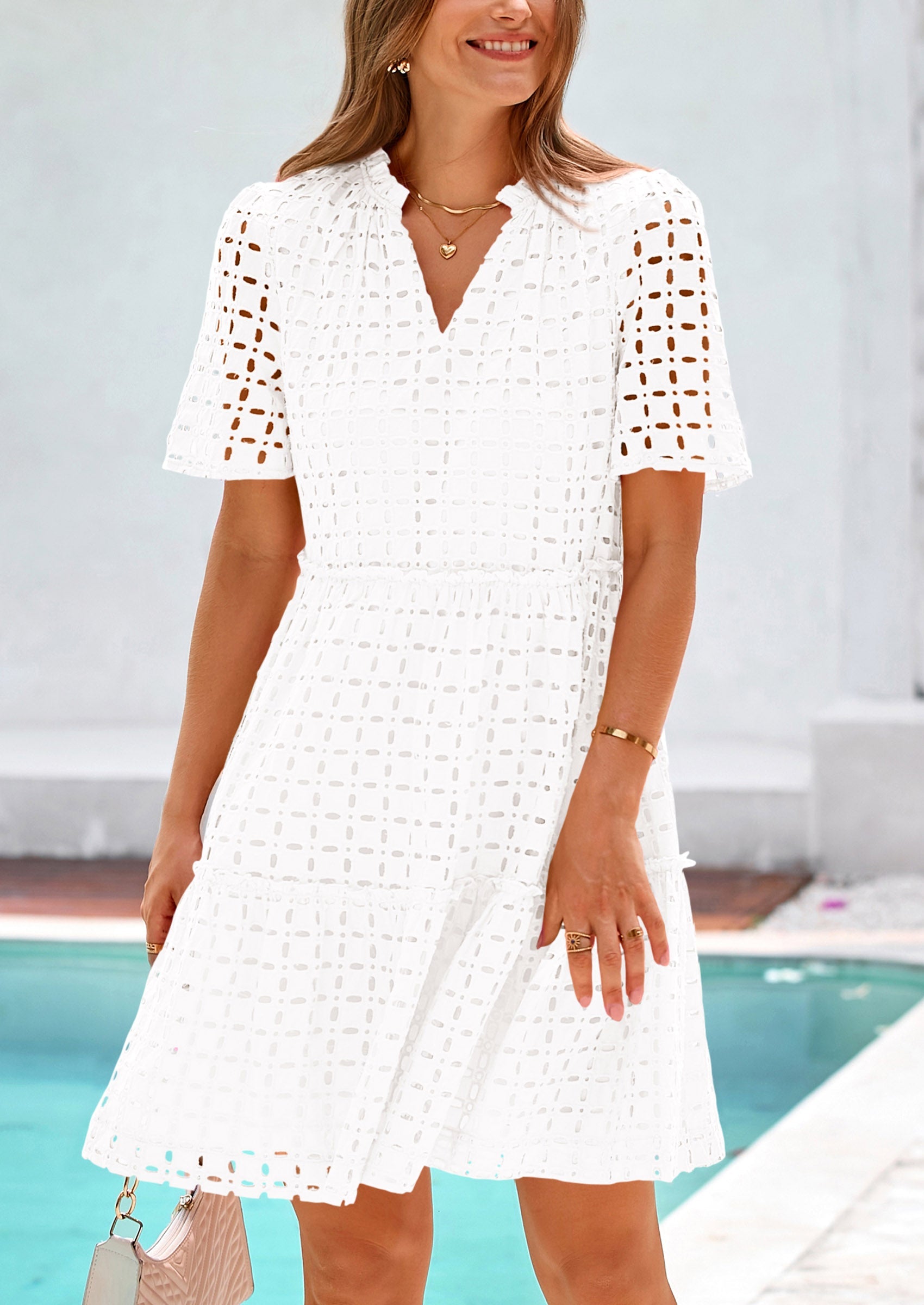 „Nia“ vereint sommerliche Leichtigkeit mit charmanten Details. Der luftige A-Linien-Schnitt mit kurzen Ärmeln, V-Ausschnitt und zarter Eyelet-Stickerei schmeichelt deiner Figur und verleiht dir einen frischen, verspielten Look. Die Volants und das Babydoll-Design sorgen für Schwung und Bewegung – ideal für City-Trips, Urlaub, Hochzeiten oder Dates. Kombiniert mit Sandalen und Sonnenhut wird „Nia“ zum It-Piece deines Sommerlooks.