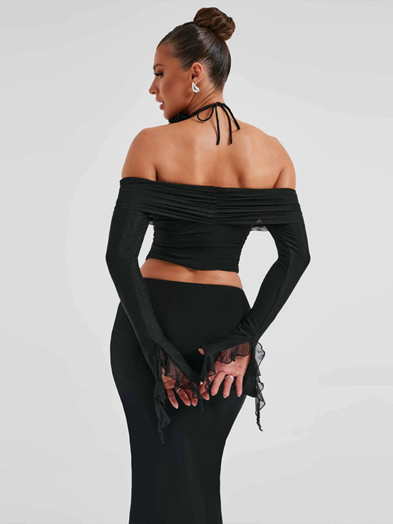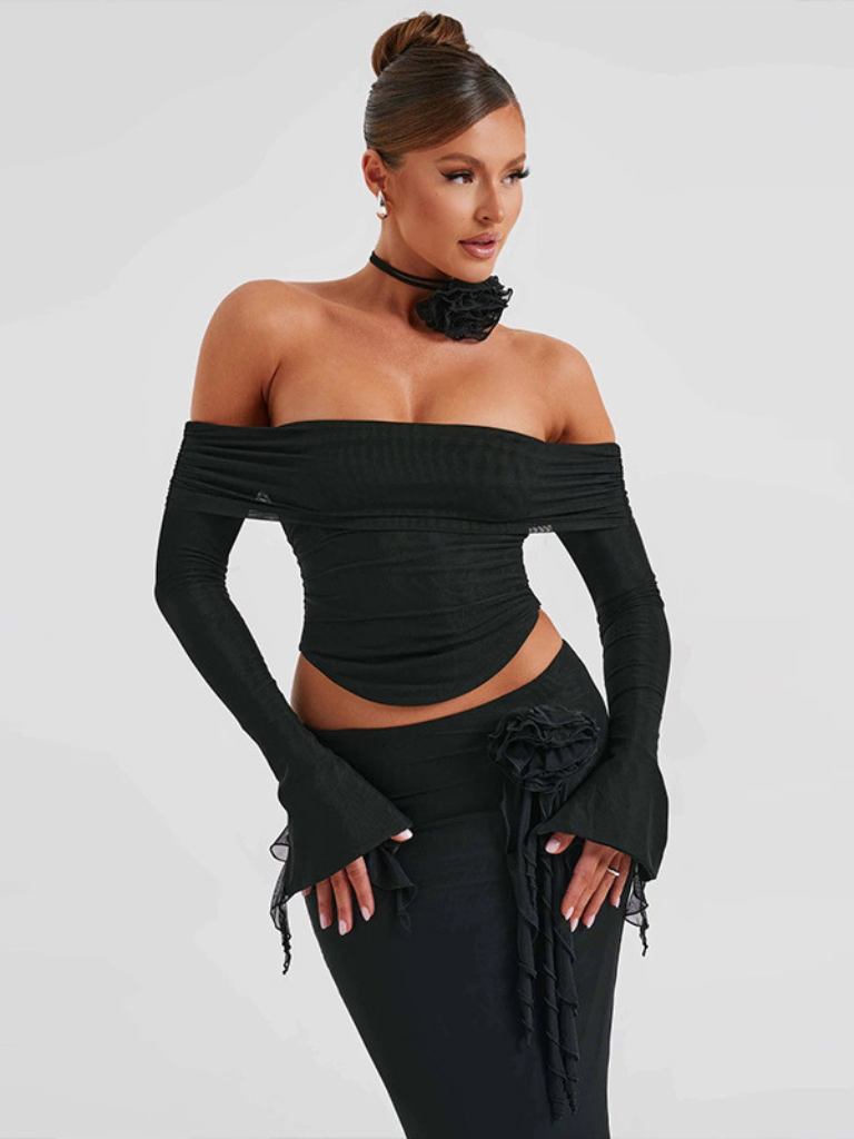 - Schulterfreies Crop-Top mit langen Ärmeln – elegant & modern