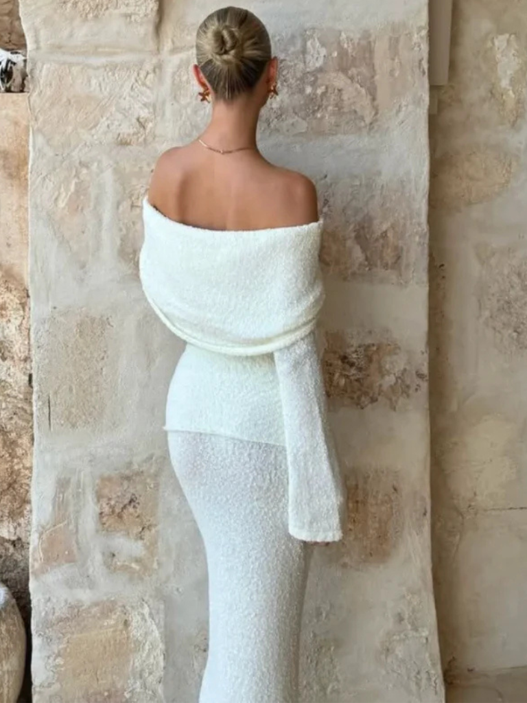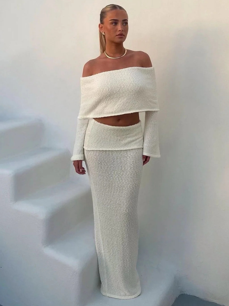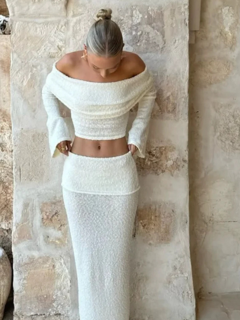 Das Serena Chic Knit Set ist dein Geheimtipp für einen mühelos eleganten Look. Dieses stilvolle Co-Ord besteht aus einem Off-Shoulder-Top mit langen Ärmeln und einem hoch taillierten Maxirock, der am unteren Teil leicht transparent ist – ein raffiniertes Detail, das dem Design eine besondere Note verleiht. Der weiche, elastische Strickstoff schmiegt sich perfekt an deinen Körper an und betont deine feminine Silhouette, ohne auf Komfort zu verzichten. Ideal für besondere Anlässe oder einen Abend, an dem du mit nur einem Outfit glänzen möchtest. Kombiniere es mit Statement-Ohrringen und einer Clutch für einen glamourösen Auftritt.