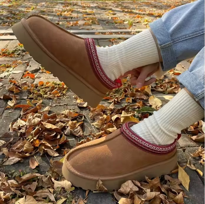 Die Plateaustiefel U♥️ aus Velours-Optik, die ich in Braun gewählt habe, erinnern optisch an Modelle bekannter Marken, wirken aber durch den rot-weißen Rand modern und besonders. Innen sind sie angenehm warm, und obwohl die Ferse offen ist, halten sie die Wärme überraschend gut – man kann sie problemlos auch draußen tragen.